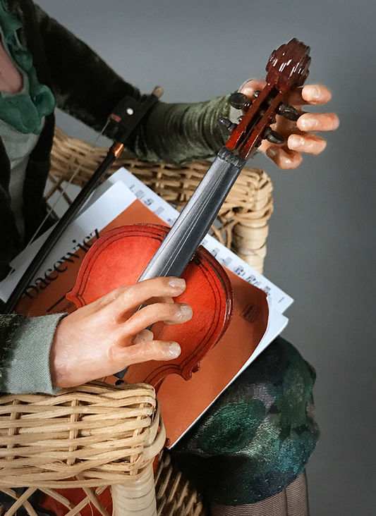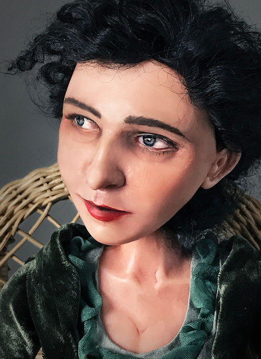 Technika wykonania lalki: Popiersie i kończyny wykonane ze specjalistycznej modeliny, ciało na drucianym stelażu pokrywanym warstwowo watą, włosy z farbowanej wełny owczej, detale twarzy malowane, oczy pokryte lakierem żywicznym.