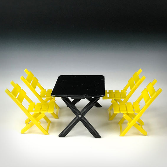 Krzesła (wys. 5,5 cm) i stół z plastiku - z kompletu „Stołówka dziecięca”. Wyrób Spółdzielni Rzemieślniczej Wielobranżowej REMBERTÓW w Warszawie, Polska, 1984 r.