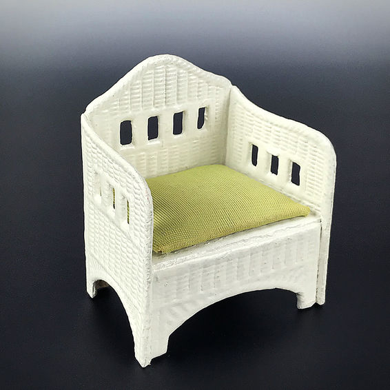 Stolik i fotele ogrodowe (wys. 7 cm) z tłoczonej, malowanej i impregnowanej tektury imitującej plecionkę wiklinową. Wyrób firmy KORBI Karl Schreiter, Niemcy, 1. poł. XX w.