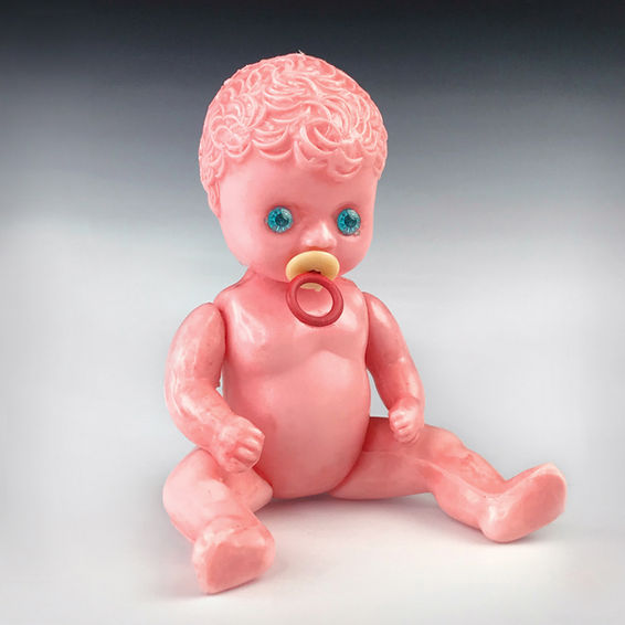 Lalka z miękkiego plastiku (wys. 14 cm) z wyjmowanym smoczkiem. Wyrób Spółdzielni Rzemieślniczej Wielobranżowej w Kłobucku, Polska, lata 50-60. XX w.