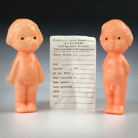 Dwie laleczki z miękkiego plastiku (wys. 8,5 cm) oraz becik obszyty koronką. Wyrób Wojewódzkiej Spółdzielni Rzemieślniczej POLITEX w Częstochowie, Polska, 1989 r.