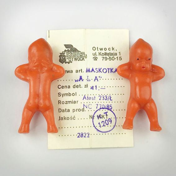 Lalka z miękkiego plastiku (wys. 10,5 cm) w sukience z kapturkiem, w komplecie z plastikową butelką ze smoczkiem. Wyrób fabryczny, Chaskowo, Bułgaria, 1983 r.